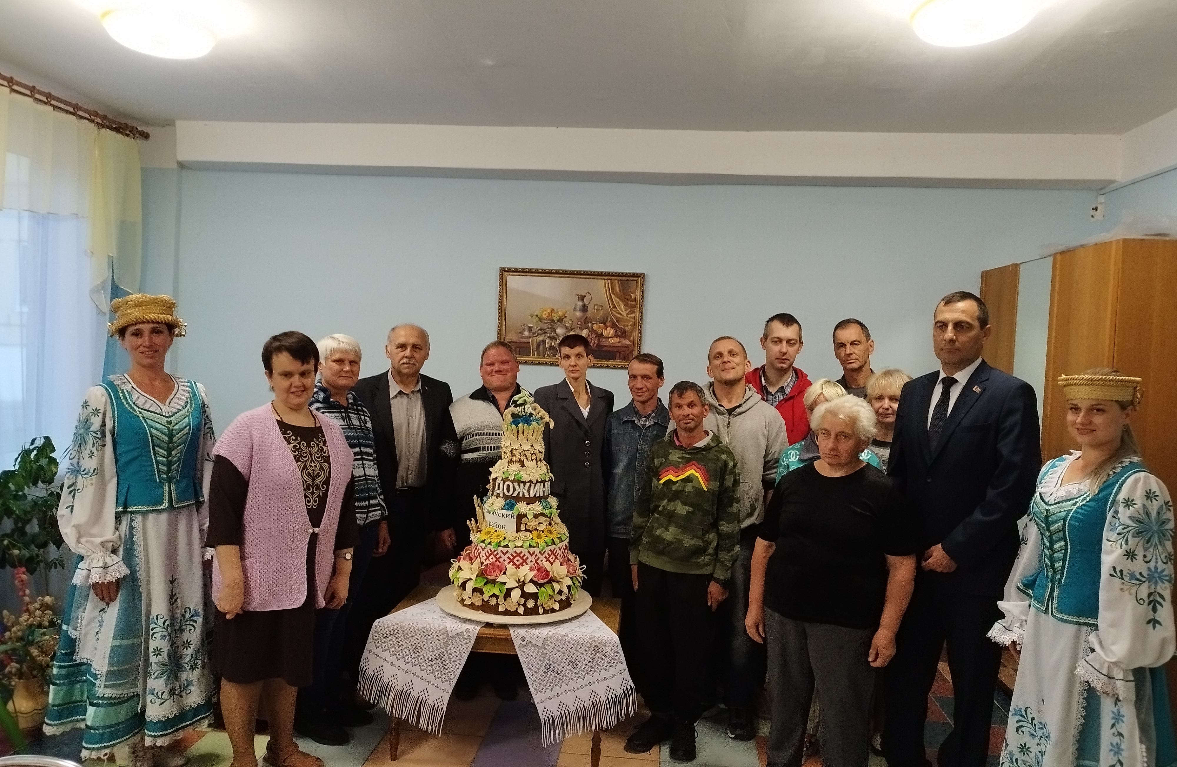 В торжественной обстановке каравай привезли в пансионат артисты районного центра культуры и отдыха, а также председатель Пуховичского районного исполнительного комитета Маевский Александр Анатольевич.